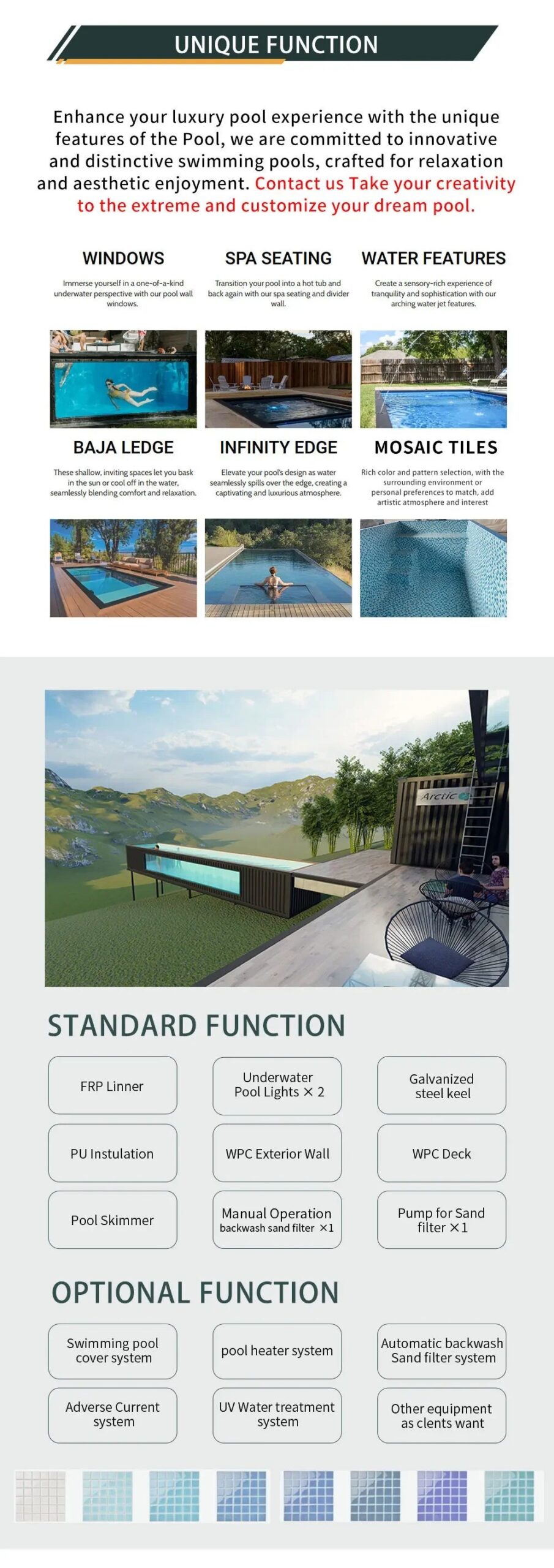 Dieser 40ft Containerpool (Premium) ist eine vorgefertigte Outdoor-Lösung für Familien – modern, großzügig und schnell realisierbar als Above-Ground-Pool. Mit hochwertiger Optik (Terrassen-/Deck-Finish) und optionaler Glaswand eignet er sich perfekt für Villa, Ferienvermietung oder gewerbliche Entspannungsbereiche.